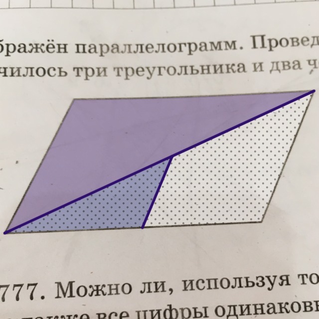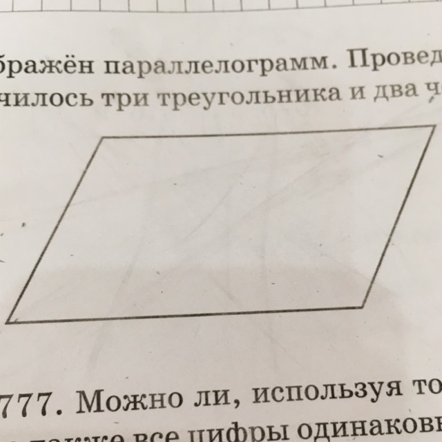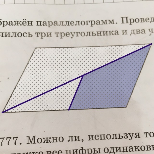 На рисунке изображен параллелограмм. Проведите в нем два отрезка так,чтобы получилось три треугольника и два четырехугольника.