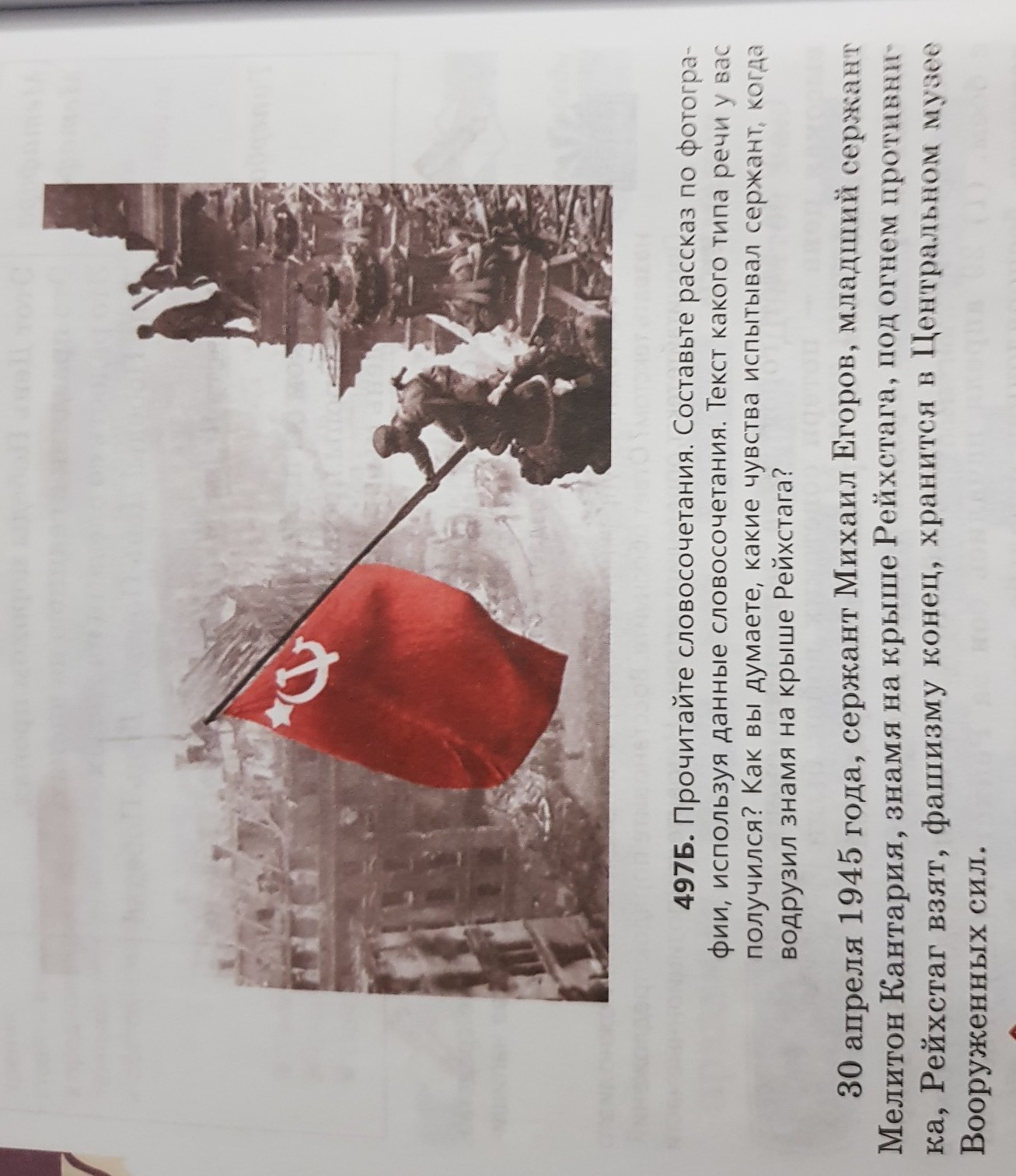 30 апреля 1945 года . Русское войско захватило Берлин. Сержант Михаил Егоров и младший сержант Мелитон Кантария под огнём противника взяли Рейхстаг . И поставили знамя на крышу Рейхстага .Фашизму конец . Теперь знамя храниться в Центральном музеи Вооружённых сил .