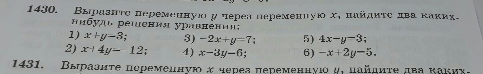 Выразитетпеременную y через переменную x, нийдите два каких нибудь решения