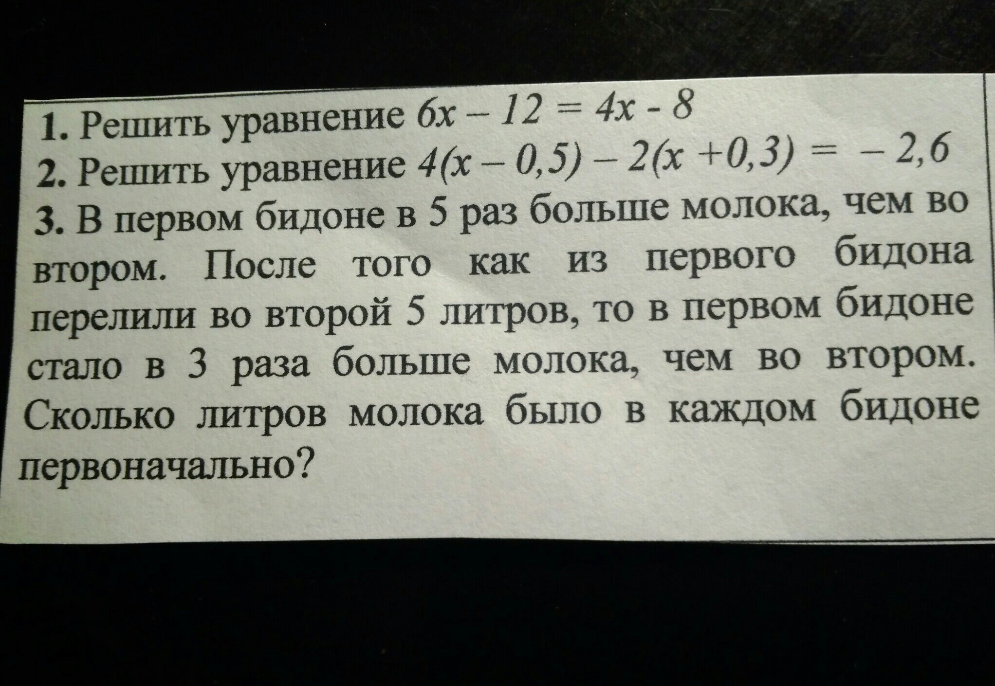 3. В первом бидоне в 5 раз больше молока,чем во втором. После того как из первого бидона перелили во второй 5 литров,то в первом бидоне стало в 3 раза больше молока,чем во втором. Сколько литров молока было в каждом бидоне первоначально?