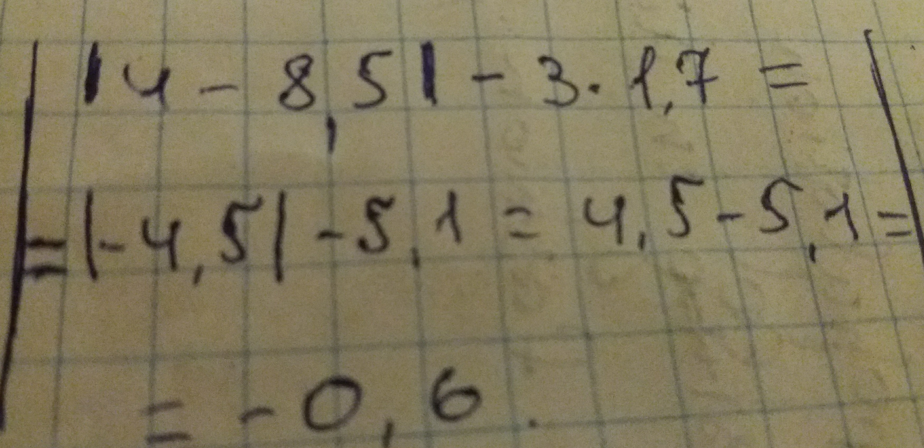 |4-5×1,7|-3|1,7|=|4-8,5|-3×1,7=|-4,5|-5,1=4,5-5,1=-0,6