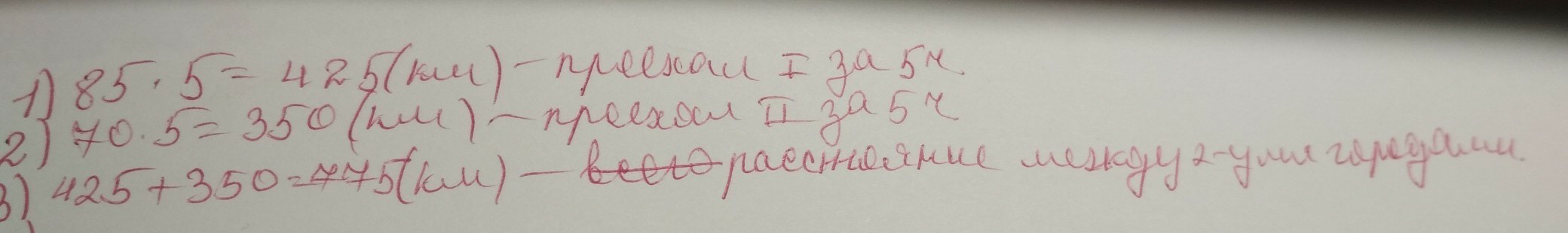 Из двух городов навстречу друг другу одновременно вышли два поезда.Скорость первого-85км/ч,второго-70км/ч.Поезда встретились через 5 ч.Найди расстояние между городами.Какое расстояние было между поездами за 2ч до встречи?