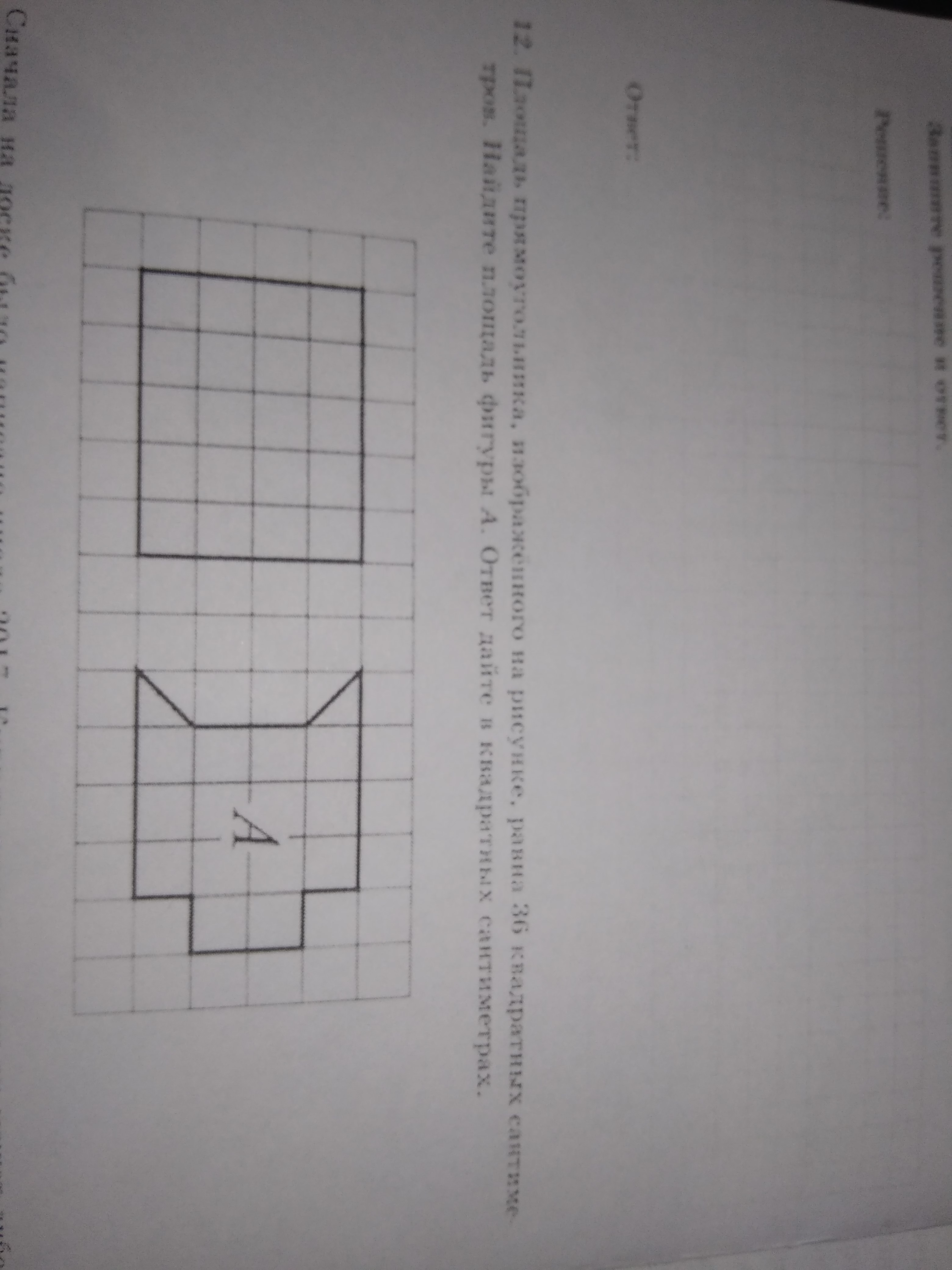 Площадь прямоугольника, изображённого на рисунке, равна 36 квадратных сантиметров. Найдите площадь фигуры А. Ответ дайте в квадратных сантиметрах.