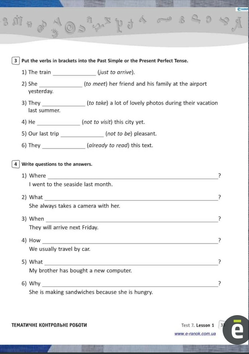 Where did you go last month?What does she always take with her?When will they arrive?How do you usually travel?What has your brother bought?Why is she making sandwiches?