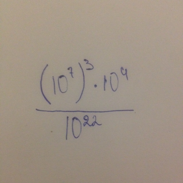 ( (10⁷)³ * 10⁴ ) / 10²² = ( 10⁷*³ ⁺⁴ ) / 10²² = 10²⁵ / 10²² =