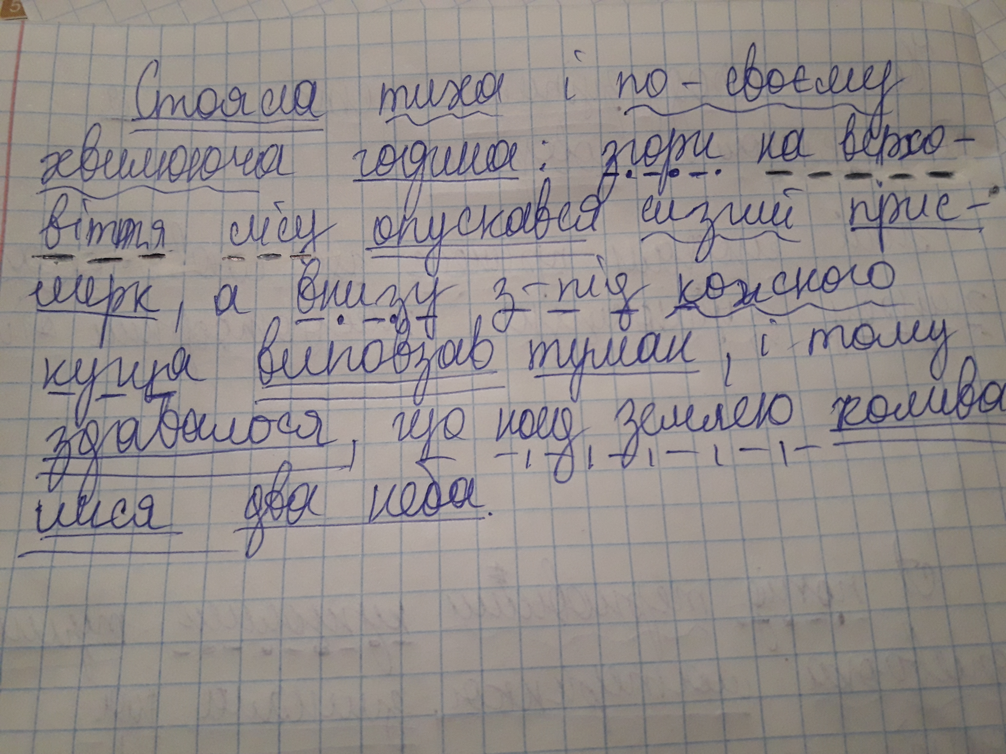 СИНТАКСИЧНИЙ РОЗБІР РЕЧЕННЯ! Стояла тиха і по - своєму хвилююча година: згори на верховіття лісу опускався сизий присмерк, а внизу з-під кожного куща виповзав туман, і тому здавалось,що над землею коливалися два неба. (М. Стельмах)