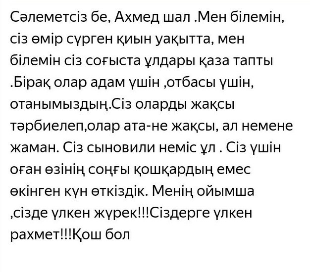 Сәлеметсіз бе, Ахмед ата. Сіз өмір сүрген қиын уақытта ұлдарыңыздың қаза тапқанын білемін. Олар адамзат үшін, отанымыздың болашағы үшін жандарын аямады. Сіз оларды жақсы тәрбиеледіңіз, ата-ана қандай болса, бала да сондай болады деген бар ғой. Сіздің ұлдарыңыз неміс. Меніңше сіздің жүрегіңіз үлкен. Сізге алғыс айтамыз. Қош болыңыз.