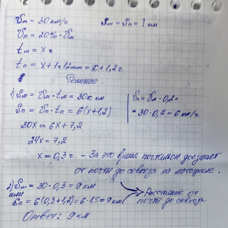 Почтальон расстояние от почты до совхоза проехал на мотоцикле со скоростью 30 км/ч. Назад он возвращался пешком со скоростью, составляющей 20%