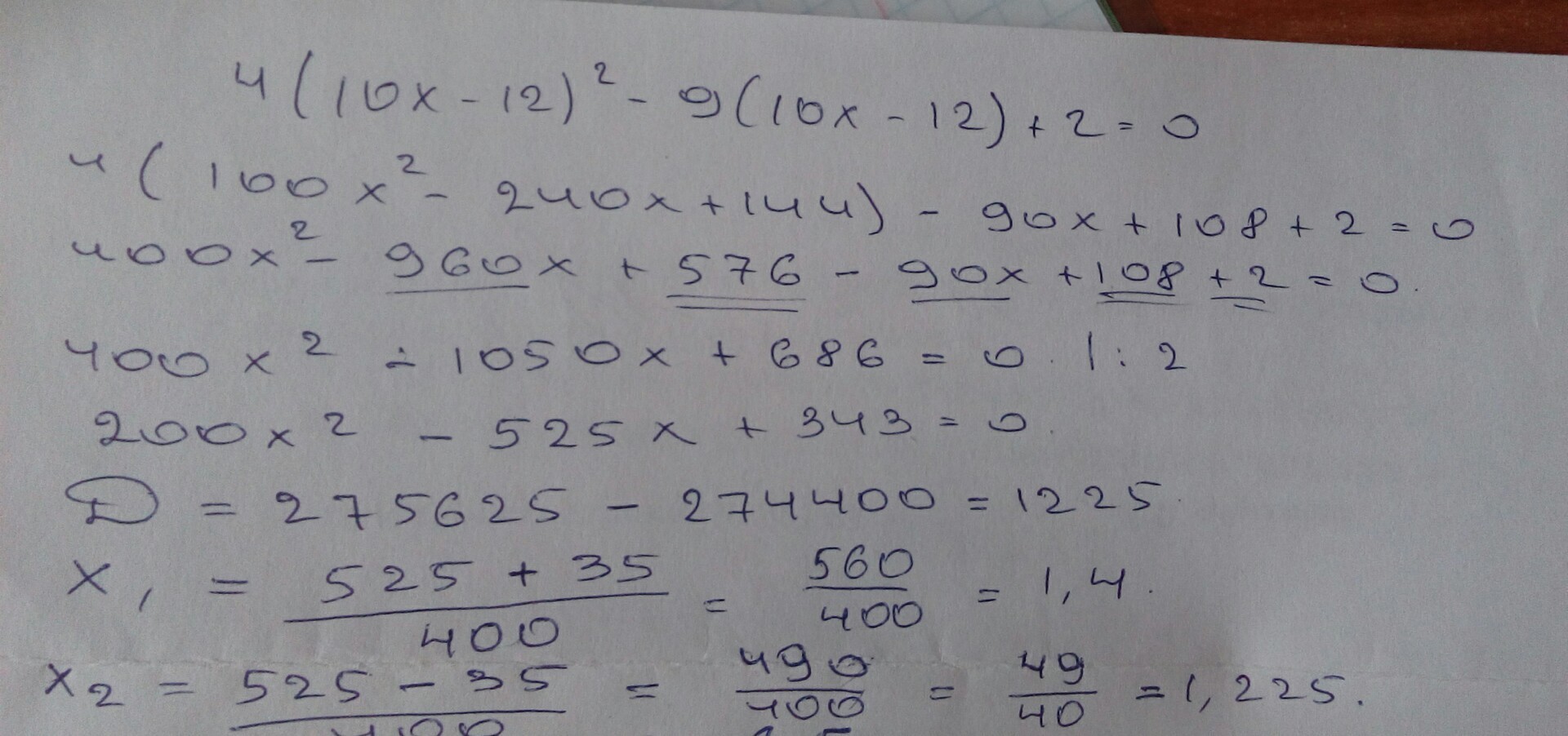 Реши квадратное уравнение 4(10x−12)^2−9(10x−12)+2=0