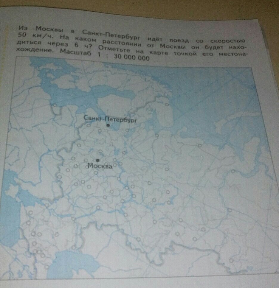 50*6=300 км пройдет поезд за 6 часов .Масштаб показывает,что в 1 см на карте 300 км на местности.Значит через 6 часов на карте поезд будет находится на расстоянии 1 см от Москвы в сторону Санкт Петербурга.