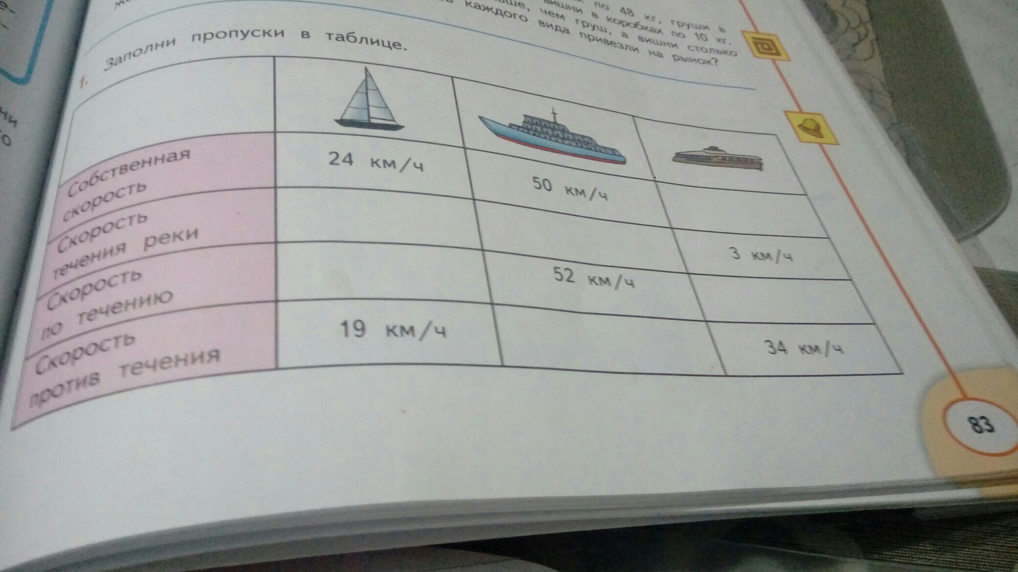 Скорость течения реки - 5 км/ч (24-19=5)