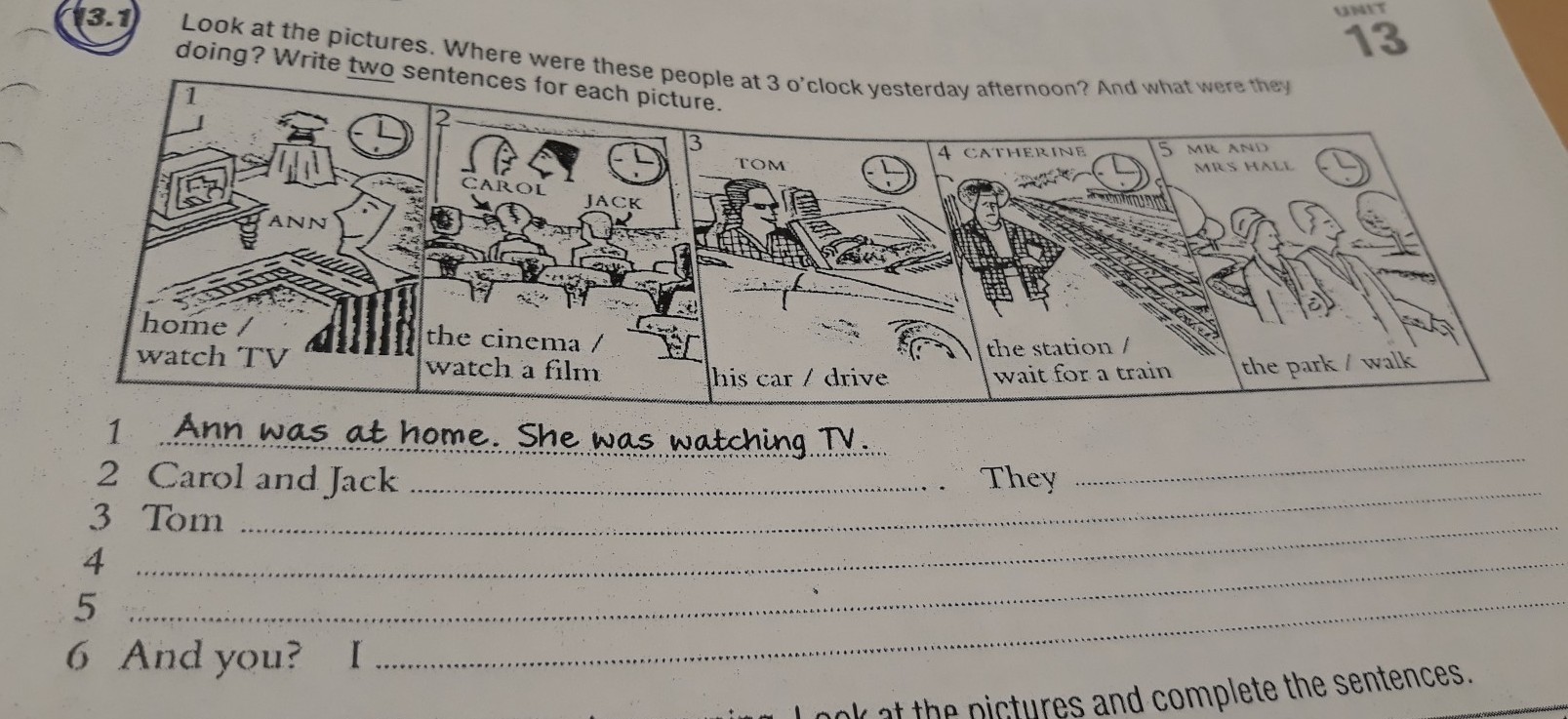 2. Carol and Jack were in the cinema. They were watching a film. 3. Tom was in his car. He was driving. 4. Catherine was at the station. She was waiting for a train. 5. Mr. and Mrs. Hall were in the park. They were walking. 6. I was at home. I was doing my homework.