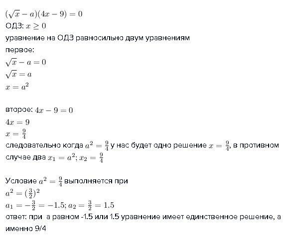 ответ: при а равном -1.5 или 1.5 уравнение имеет единственное решение, а именно 9/4