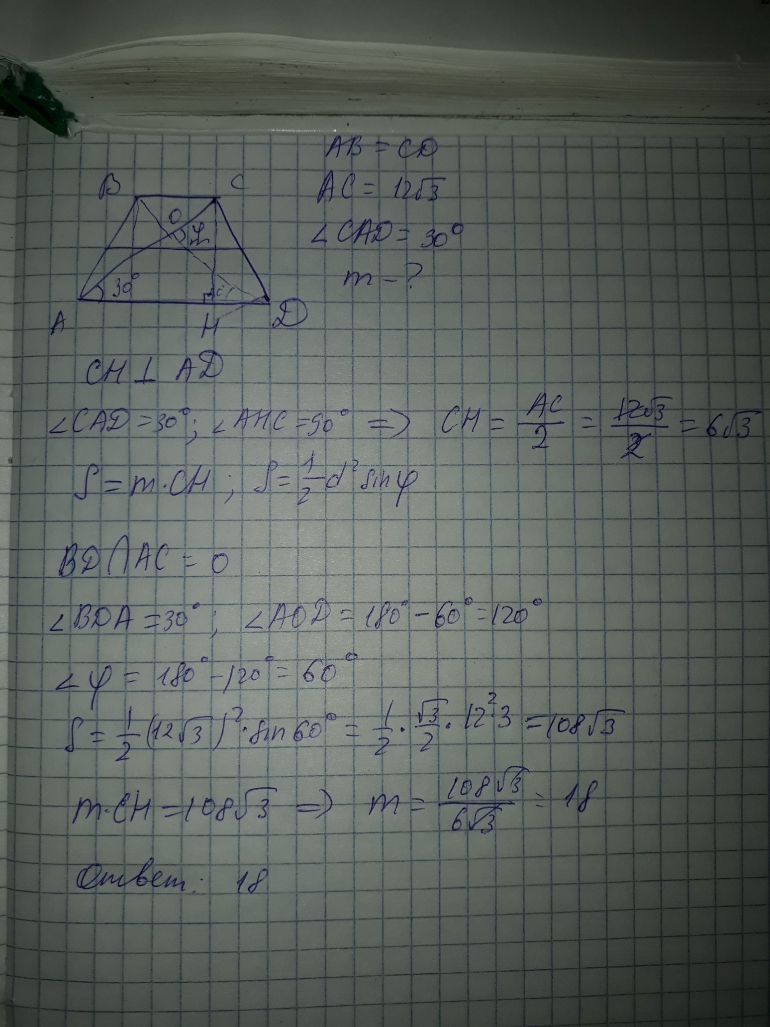 В равнобедренной трапеции диагональ, равна 12√3, образует с основание угол 30°. Чему равна средняя линия трапеции