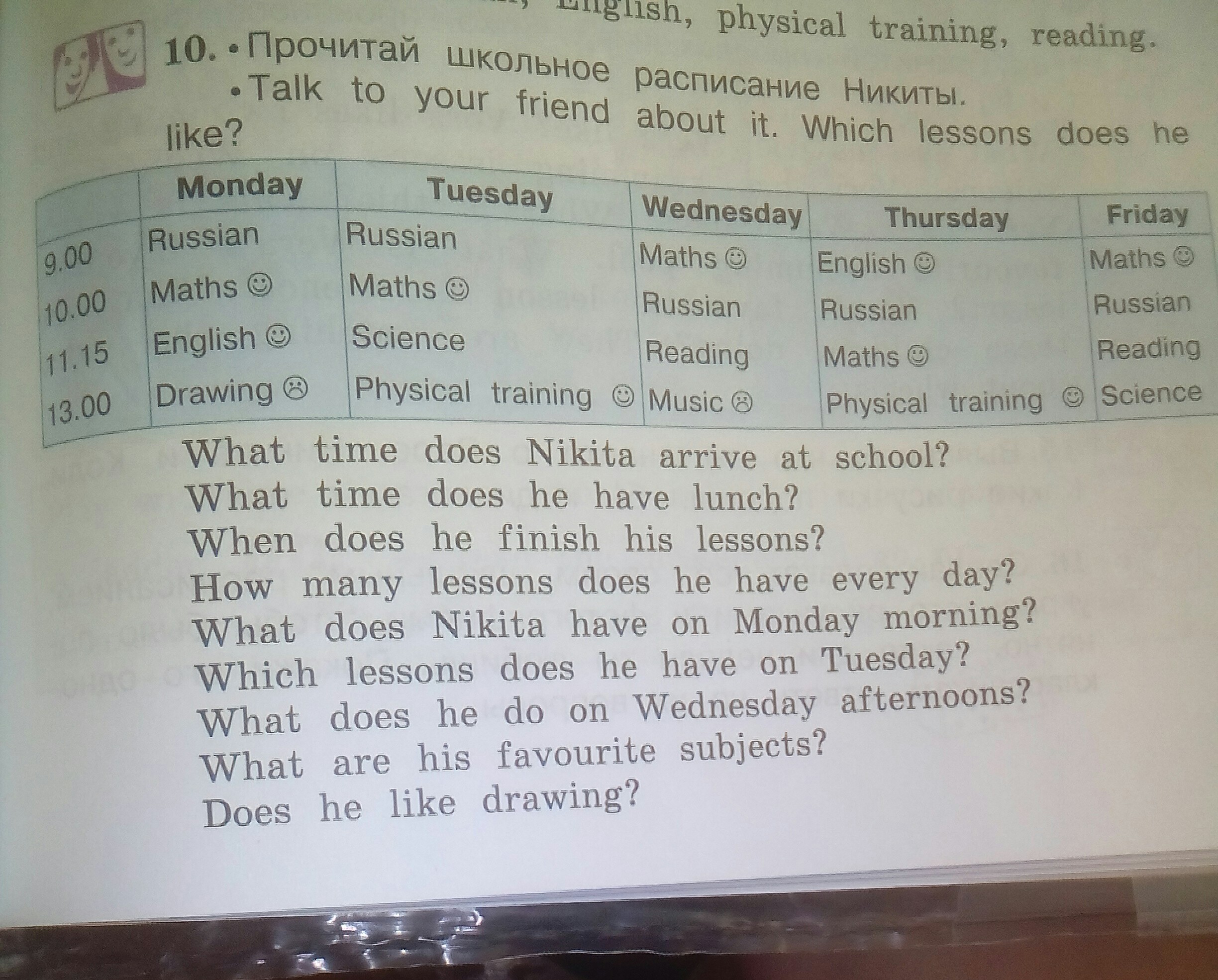 6) He has Russian, Maths, Science, Physical training on Tuesday