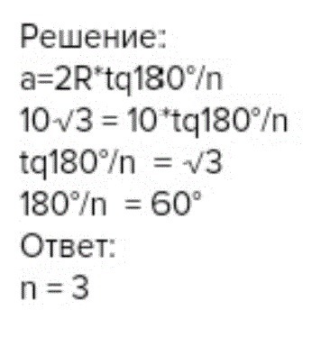 Діаметр кола, вписаного в правильний многокутник, дорівнює 10 см, а сторона многокутника - 10√3 см. Знайдіть кількість сторін даного многокутника і радіус описаного кола.
