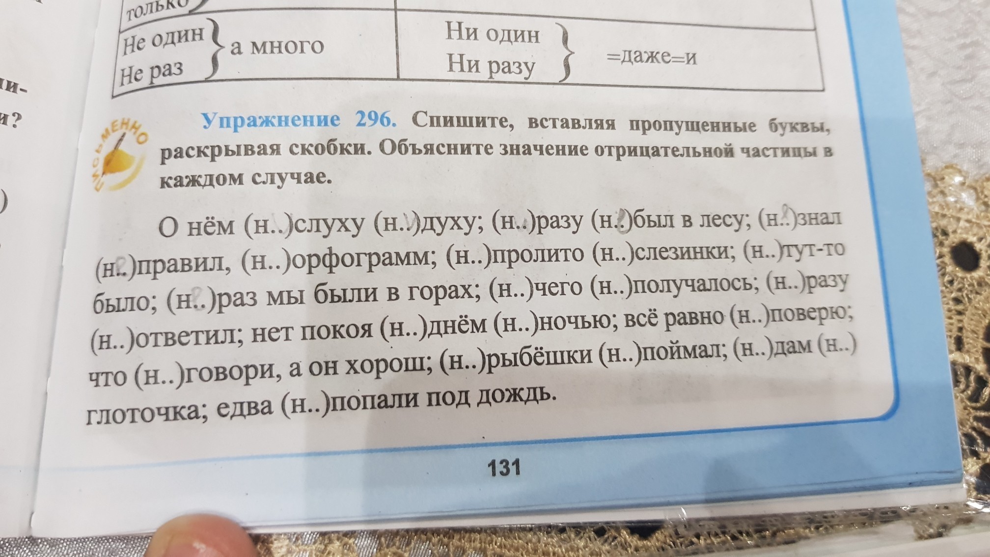 О нем НИ слуху НИ духу; НИ разу НЕ был в лесу; НЕ знал НИ правил НИ орфограмм; НЕ пролито НИ слезинки; НЕ тут-то было; НЕ раз мы были в горах; НИчего НЕ получалось; НИ разу НЕ ответил; нет покоя НИ днём НИ ночью; всё равно НЕ поверю; что НИ говори, а он хорош; НИ рыбёшки НЕ поймал; НЕ дам НИ глоточка; едва НЕ попали под дождь.