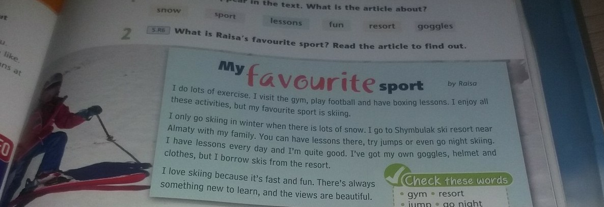 я катаюсь на лыжах зимой когда идёт снег.Я езжу на Шымбулаксий лыжный курорт возле Алматы со своей семьей. вы можете провести там занятия, или даже прыгать и кататься на лыжах.я занимаюсь каждый день и довольно хорошо.у меня есть собственные очки, свой шлем, и лыжную одежду. но лыжи я беру на курорте.