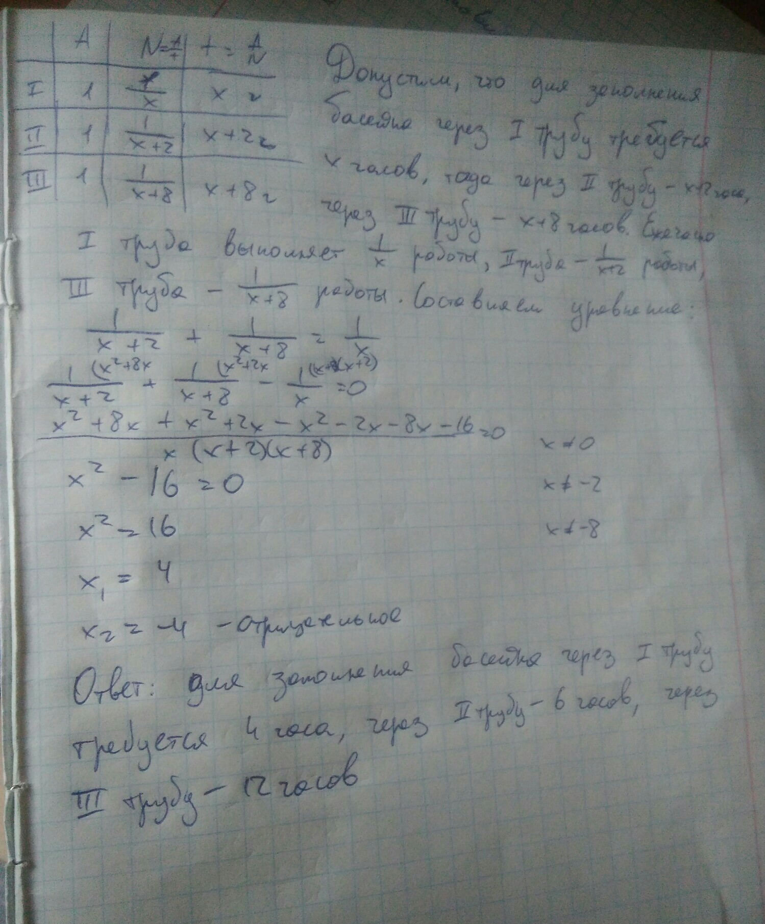 Для наполнения бассейна через первую трубу требуется столько же времени, как и для наполнения через вторую и третью трубы одновременно. Через первую трубу бассейн наполняется на 2 ч быстрее, чем через вторую, и на 8 ч быстрее, чем через третью. Сколько времени требуется для наполнения бассейна через каждую трубу?