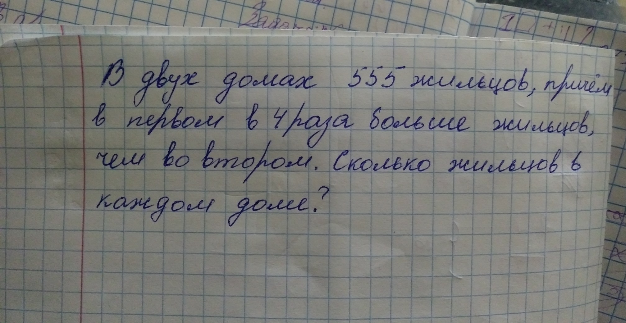 Пусть x жильцов во втором доме, значит в первом 4x жильцов