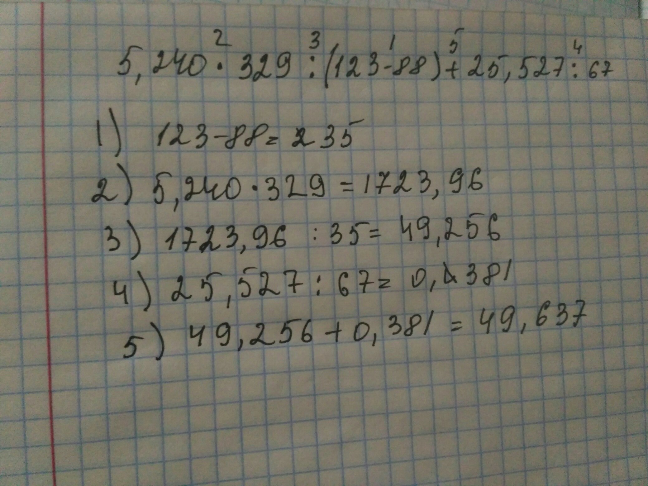 найдите значения выражения 5.240 x 329 : (123 - 88) + 25.527 : 67