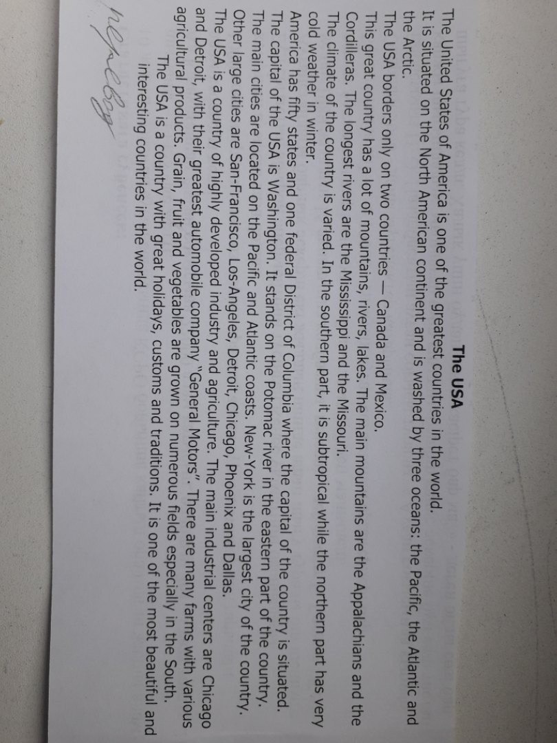 Соединенные Штаты В мире. Америки является одной из величайших стран. Он расположен на североамериканском континенте и омывается тремя океанами: Тихий океан, Атлантический океан и США граничат только с двумя странами. Канада и Мексика. В этой великой стране много гор, рек , озера. Кордильеры. Самые большие главные горы - Аппалачи и реки - Миссисипи и Миссури. Климат страны разнообразен. В южной части он субтропический, в то время как у части очень холодная погода в Америке нет пятидесяти штатов и одного федерального округа Колумбия, где столицей страны является столица США, является Вашингтон, она стоит на реке Потомак в восточной части страны. Основные города расположены на тихоокеанском и атлантическом побережье. Нью-Йорк - крупнейший город, в котором другие крупные города - Сан-Франциско, Лос-Анджелес, Детройт, Чикаго, Феникс и Даллас. США - страна высокоразвитой промышленности и сельского хозяйства. Основные промышленные центры «Чикаг» и «Детройт» с их крупнейшей автомобильной компанией «General» - это сельскохозяйственные продукты vario, Motors ». Есть много с зерном, фрукты и овощи выращиваются на многих полях, особенно на юге. США - страна с прекрасными праздниками, обычаями и традициями. Это одна из самых красивых и интересных стран в мире.