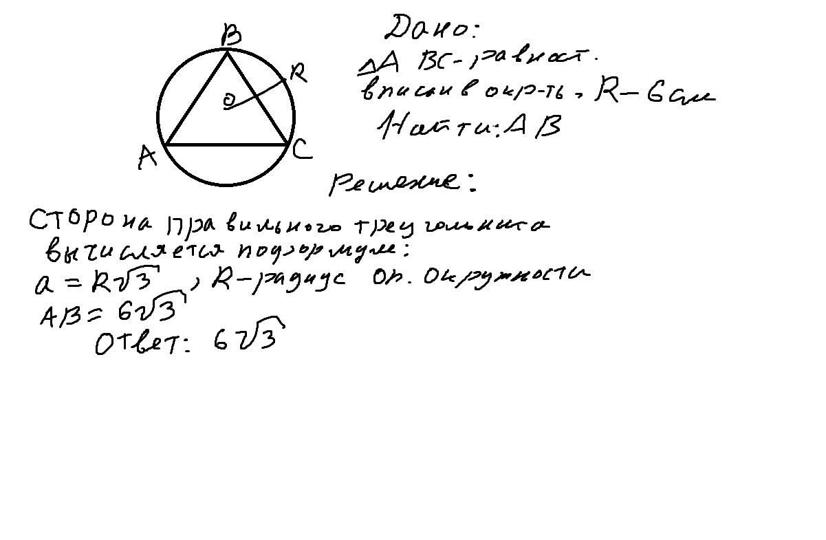 равносторонний треугольник abc вписан в окружность радиуса 6 см. Найдите его сторону.