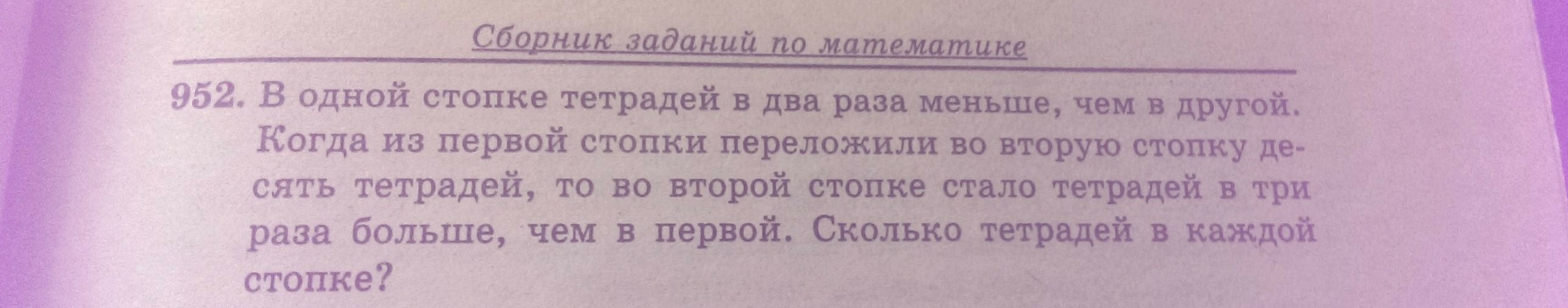 В одной стопке тетрадей в два раза меньше чем в другой. Когда из первой стопки переложили во вторую стопку десять тетрадей, то во второй стопке стало тетрадей в три раза больше чем в первой. Сколько тетрадей в каждой стопке?