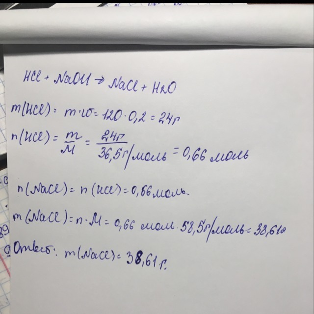 Какую массу и какое количество соли можно получить при взаимодействие 120 г 20% раствора соляной кислоты с гидроксидом натрия