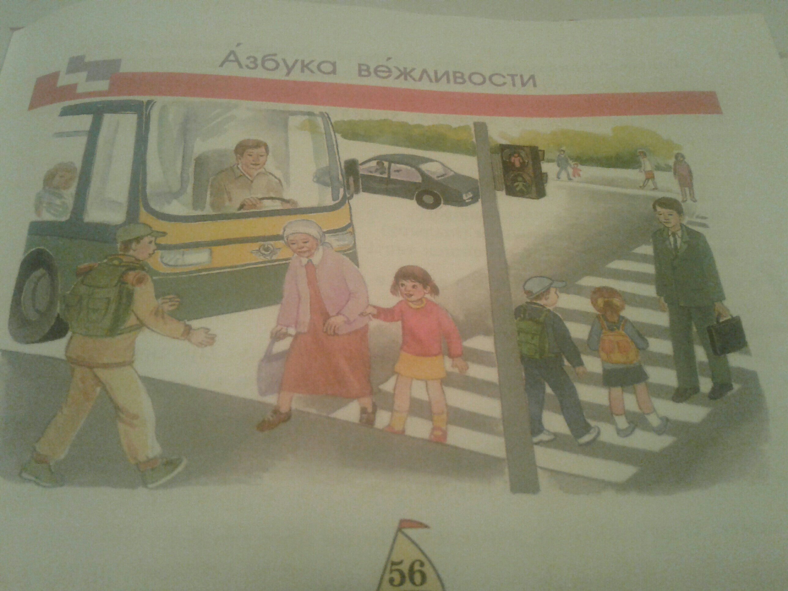 На картине изображена вежливость молодых людей по отношению к старшему поколению например:девочка помогает бабушке перейти дорогу,дети из вежливости приветствуют мужчину показывая своё хорошее воспитание.