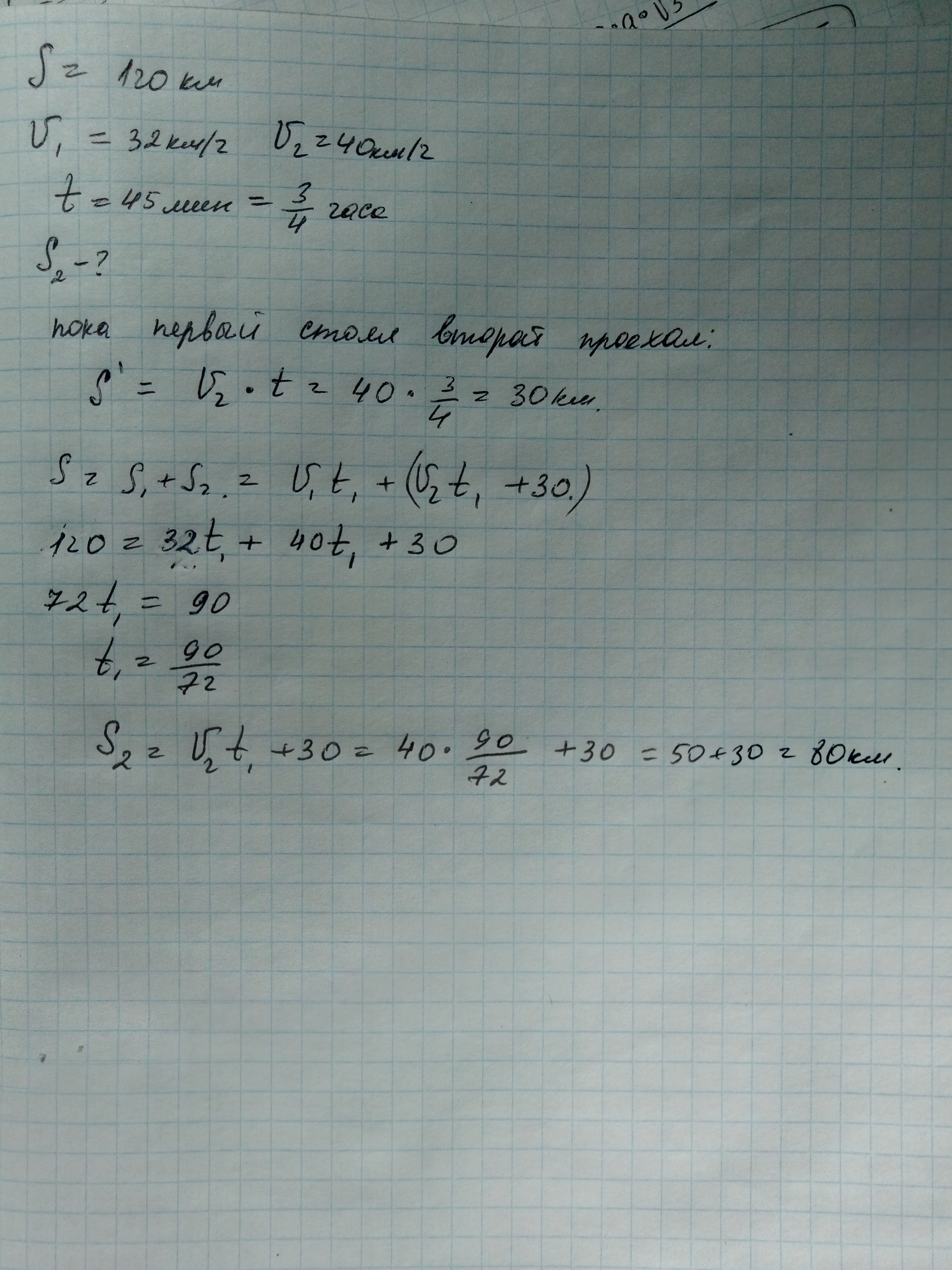 Из двух городов одновременно навстречу друг другу отправляются два трактора. Проехав некоторую часть пути, первый тракторист сделал остановку на 45 минут, а затем продолжил движение до встречи со вторым трактористом. Расстояние между городами составляет 120 км, скорость первого тракториста равна 32 км/ч, скорость второго- 40 км/ч. Определите расстояние от города, из которого выехал второй тракторист, до места встречи.