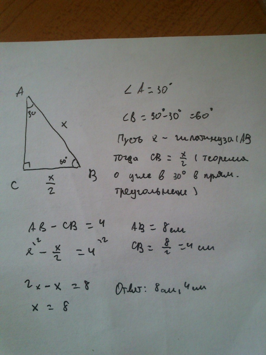 Один з кутів прямокутного трикутника =30°, а сума гіпотенузи та найменшого з катетів =30см. Знайдіть гіпотенузу трикутника.