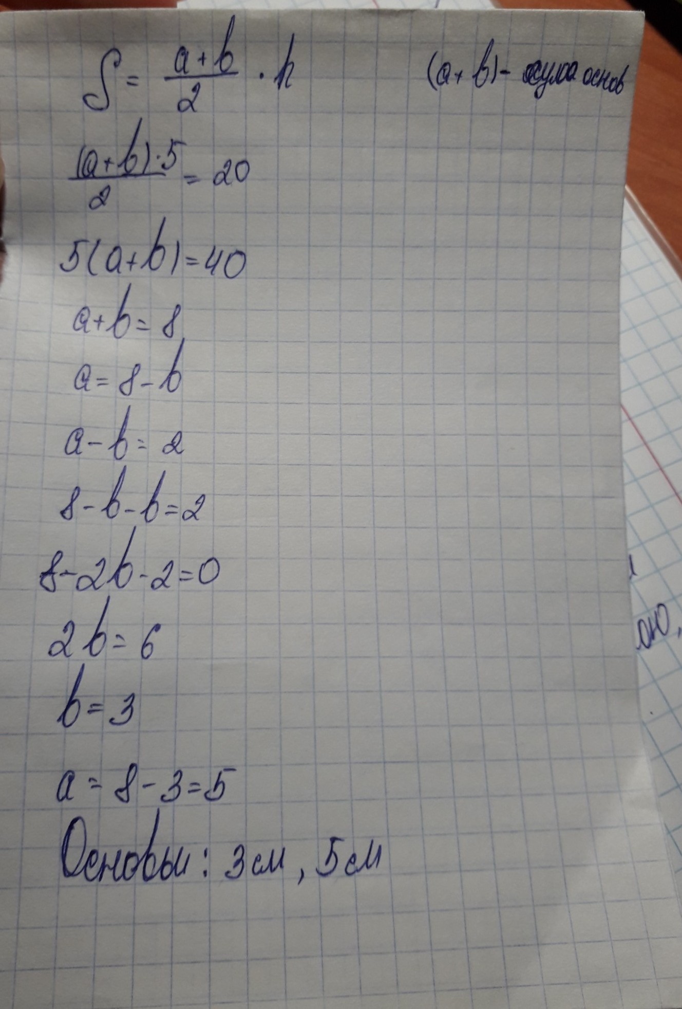 Найти основы трапеции площа какого 20 см2 высота 5 см а разница основ 2 см ПОМОГИТЕ ПОЖАЛУЙСТАААААААААААА