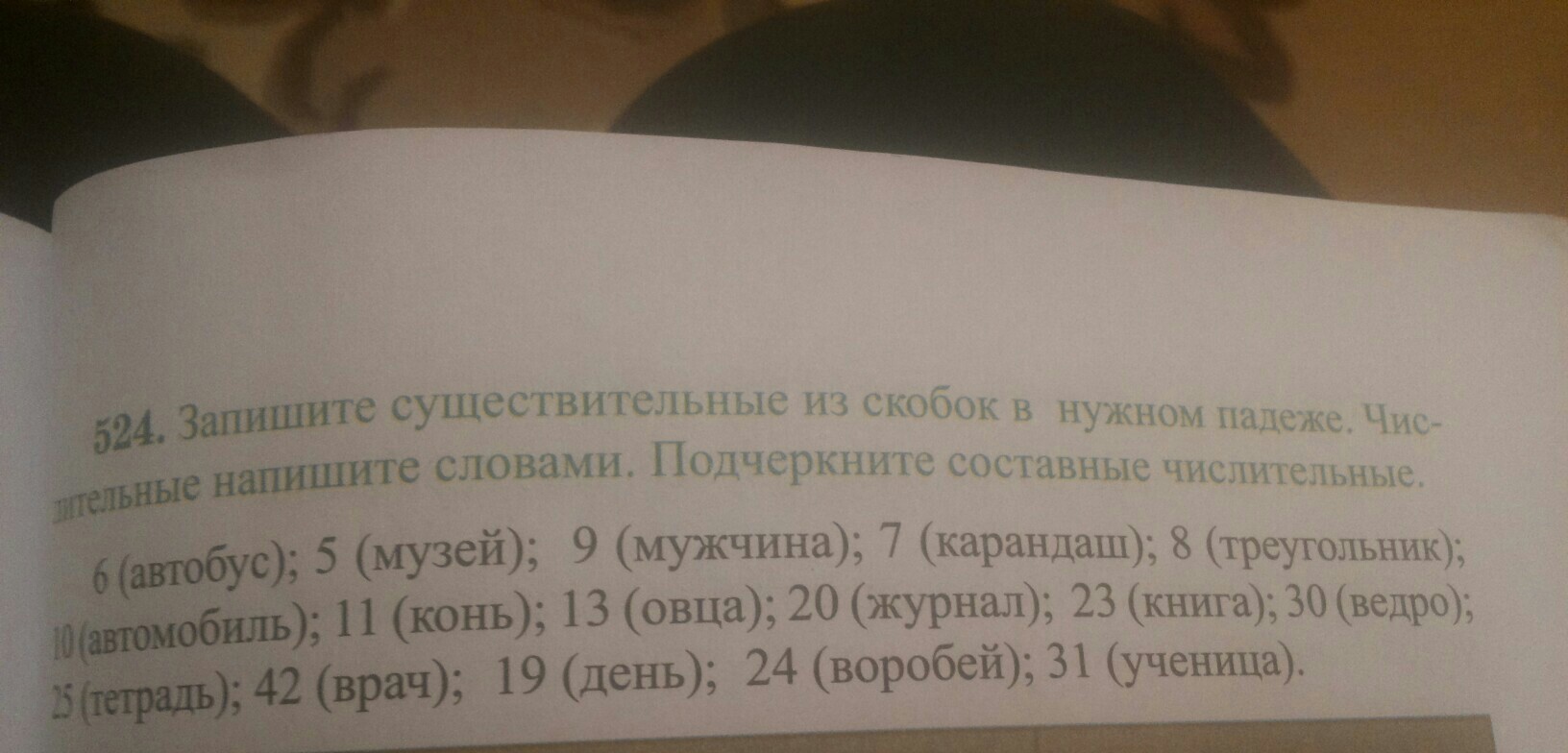 шесть автобусов, 5 музеев, 9 мужчин, 7 карандашей, 8 треугольников, 10 автомобилей, 11 коней, 13 овец, 20 журналов, 23 книги, 30 вёдер, 25 тетрадей, 42 врача, 19 дней, 24 воробья, 31 учениц(ученица)