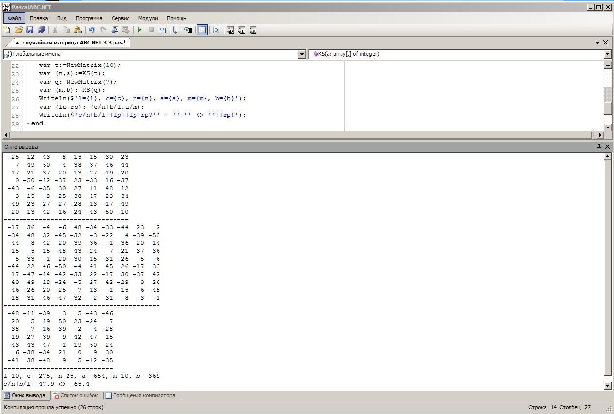 Решить уравнение c/n+b/l=a/m, где l,c – количество и сумма отрицательных элементов матрицы d(8,8) , расположенных выше главной диагонали;n,a – количество и сумма отрицательных элементов матрицы t(10,10) , расположенных выше главной диагонали;m,b – количество и сумма отрицательных элементов матрицыq(7,7) , расположенных выше главной диагонали. Знакопеременные массивы сформировать случайным образом. на языке паскаль.