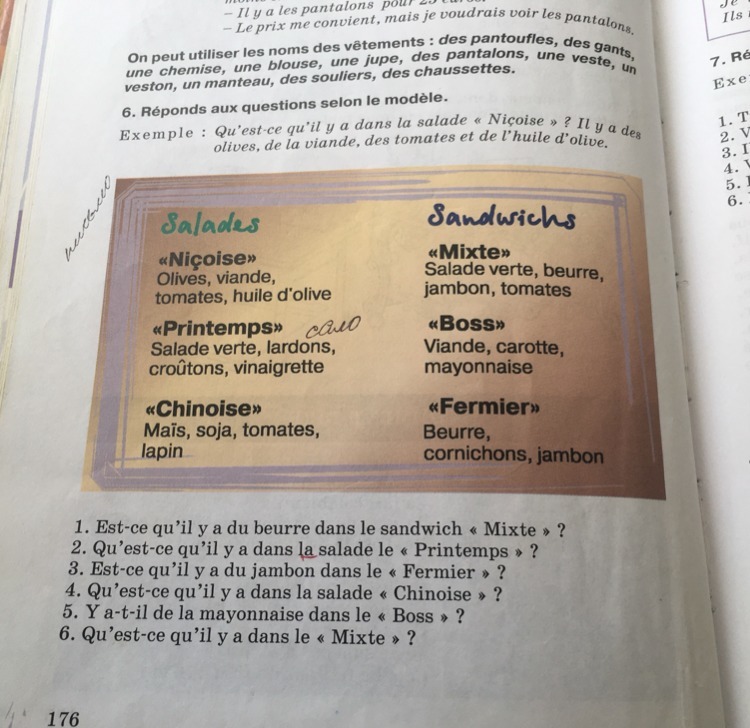 6) Il y'a de la salade verte, du beurre, du jambon, et des tomates.