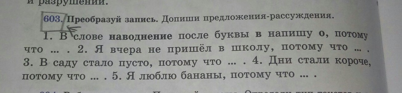 1)В слове наводнение после буквы в напишу букву о, потому что проверочное слово воды. 2) Я вчера не прошёл в школу, потому что у меня болел живот. 3) В саду стало пусто, потому что все разошлись по домам. 4) Дни стали короче, потому что приближалась зима. 5) Я люблю бананы, потому что они очень вкусные.