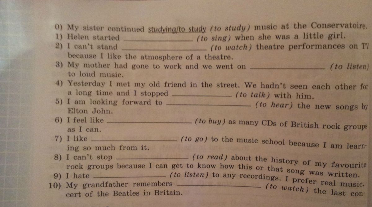 1-singing,2-watching.3-listening.4-to talk.5-hear.6-buying.7-to go.8-reading.9-listening.-10-watching