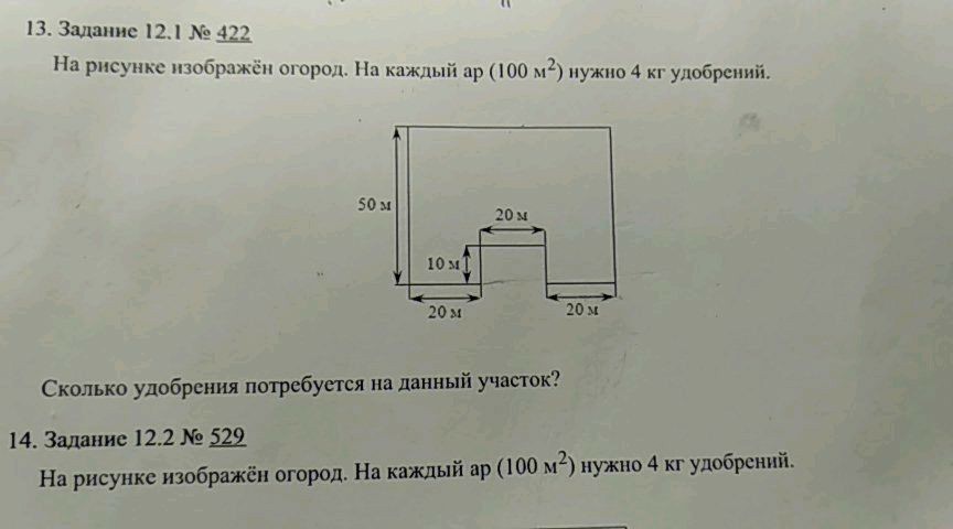 На, 50*(20+20+20)=50*60=3 000 (м2). Площадь выреза равна 10*20=200 (м2). площадь огорода равна 3000-200= 2 800 (м2) = 28 (a); площадь второго огорода точно такая же. На каждый участок нужно 28*4=112 (кг) удобрений. На оба участка нужно 112*2=224 (кг). Ответ: по 112 кг; 224к кг. Всё.