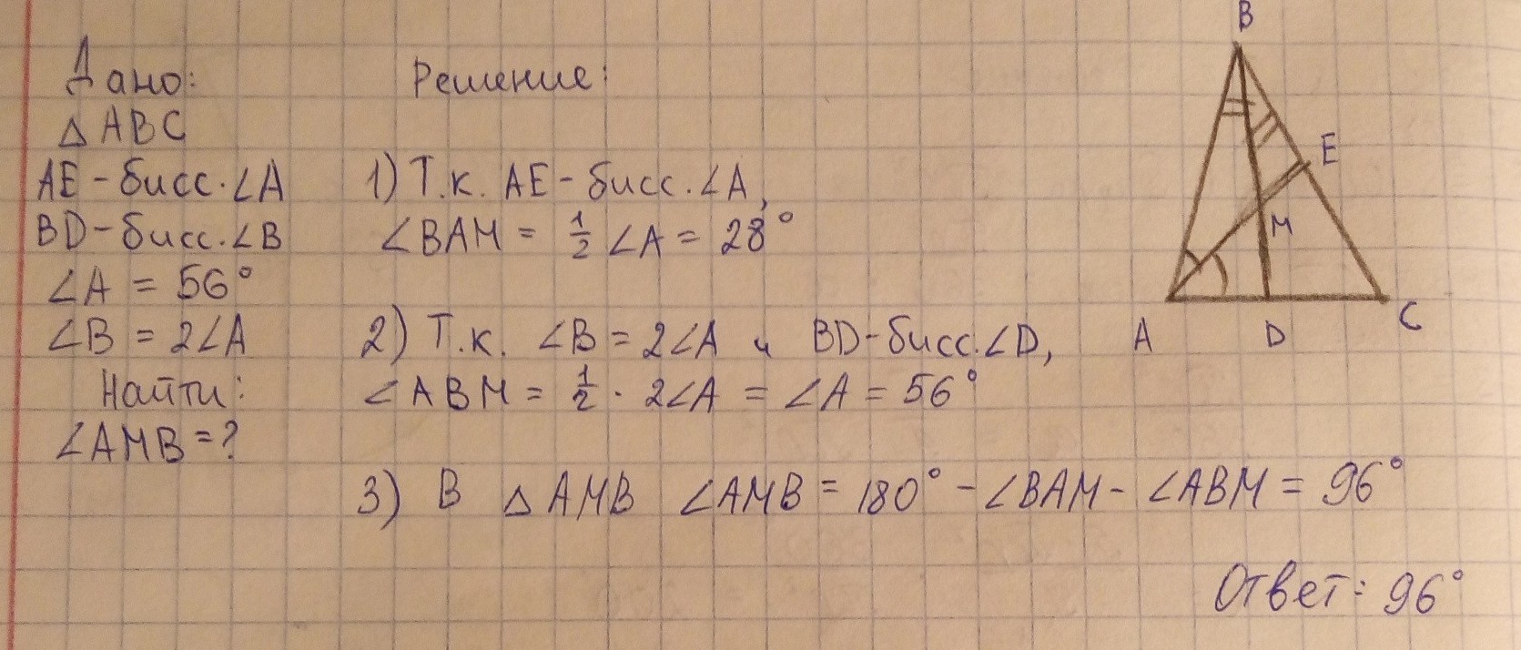 Биссектрисы углов А и В треугольника АВС пересекаются в точке М.Найдите угол АМВ , если угол А равен 56 градусов , угол В в 2 раза больше угла А.