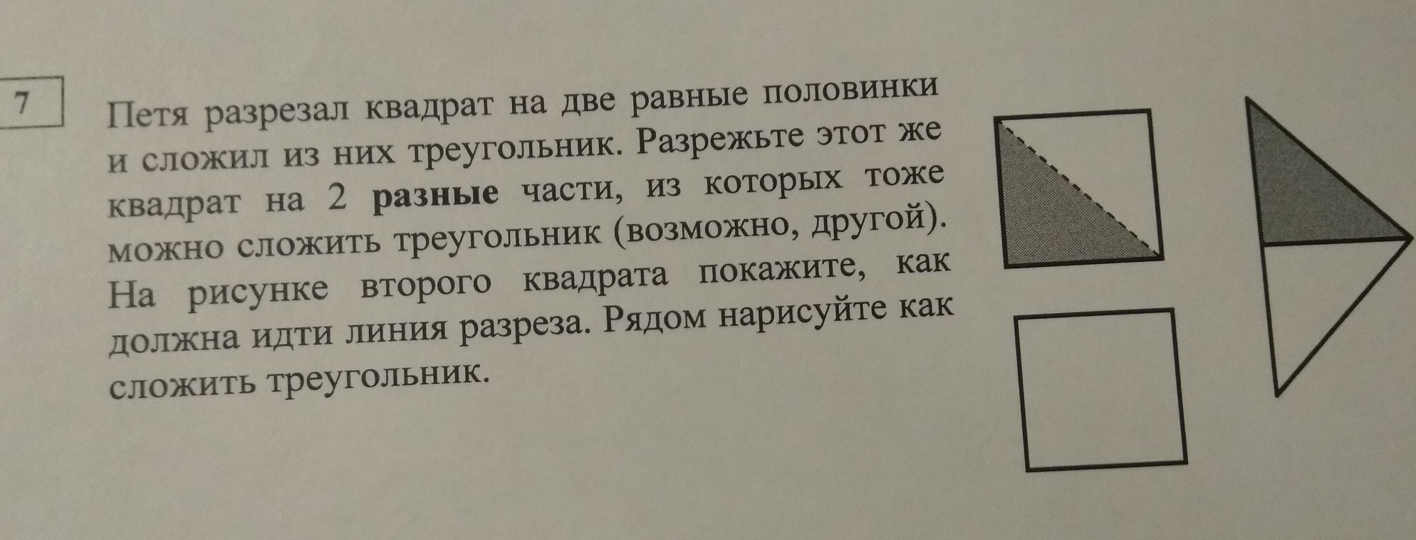 провести линию разреза от верхнего угла до середины нижней грани