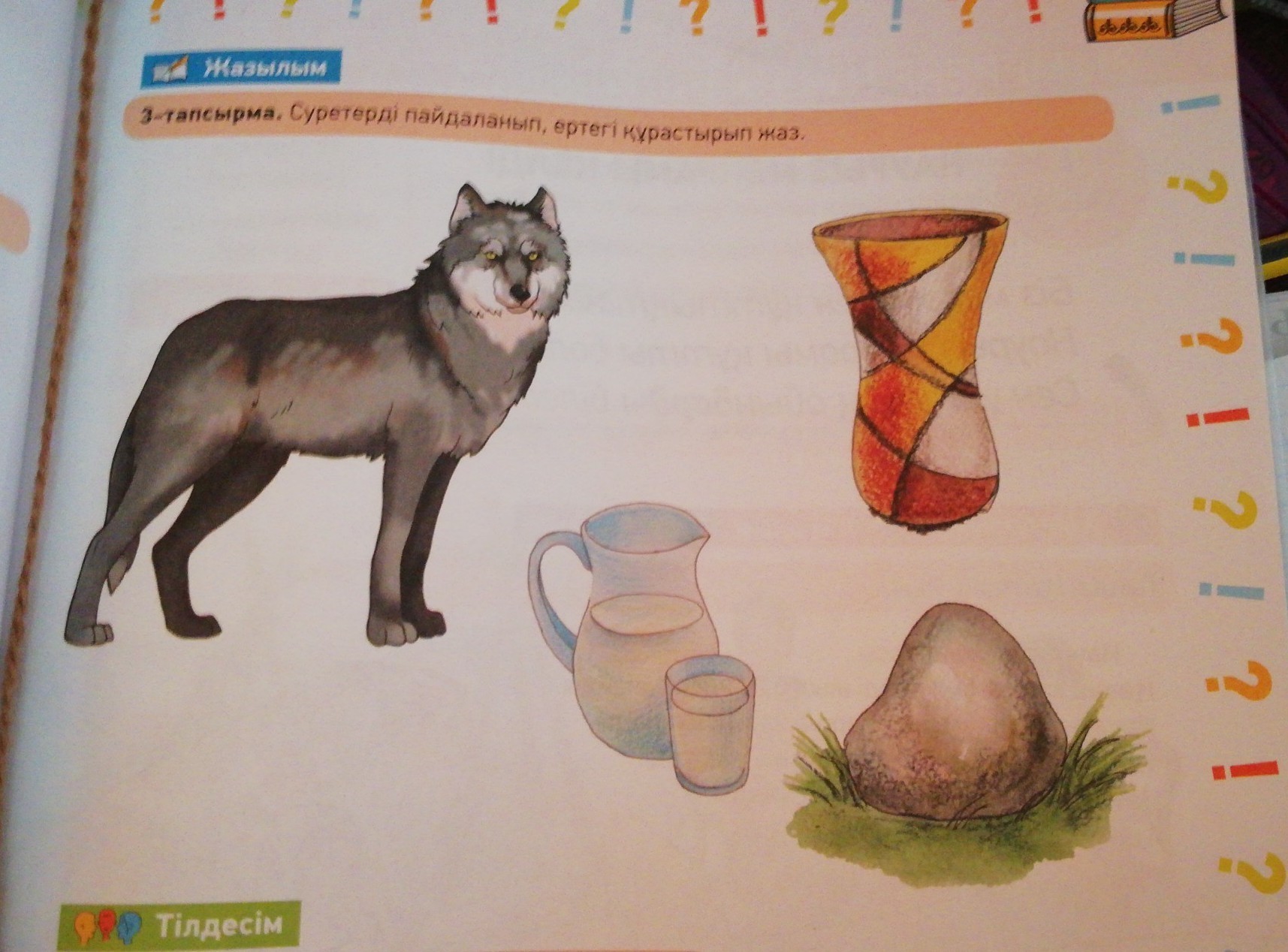 Біздін жерде өте көп ақылды жануарларды бар. Бір күнде ақылды волк болды. Ол су іштып жатыр. Мында тек кувшин және камень болды. Ол камень акелді. Ол кішкентай болды. Ол осы камень кувшинде жатыр. Су үлкен болды және волк су іштп