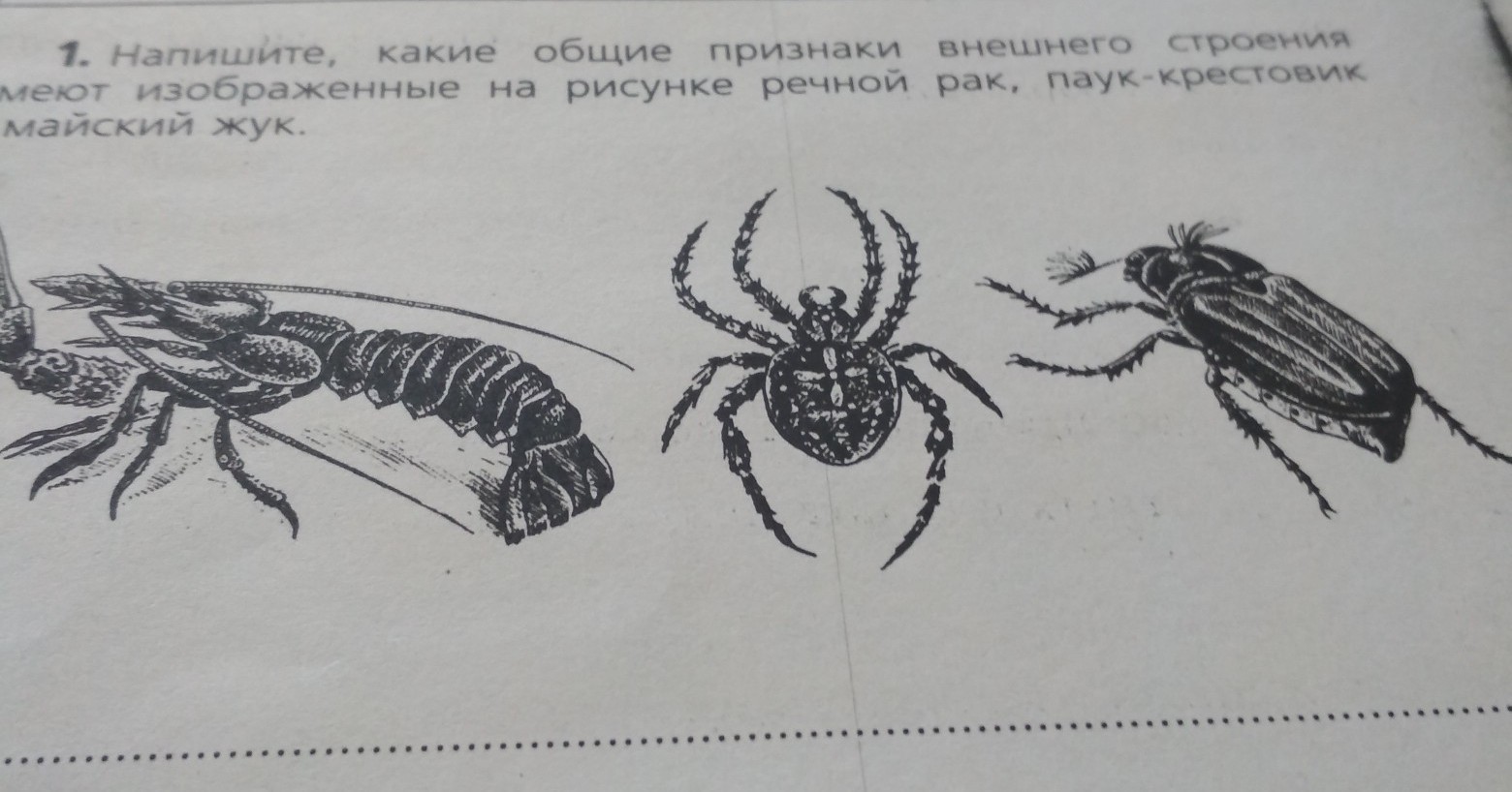 напишите, какие общие признаки внешнего строения имеют изображенные на рисунке рисунке речной рак, паук крестовик, и майский жук
