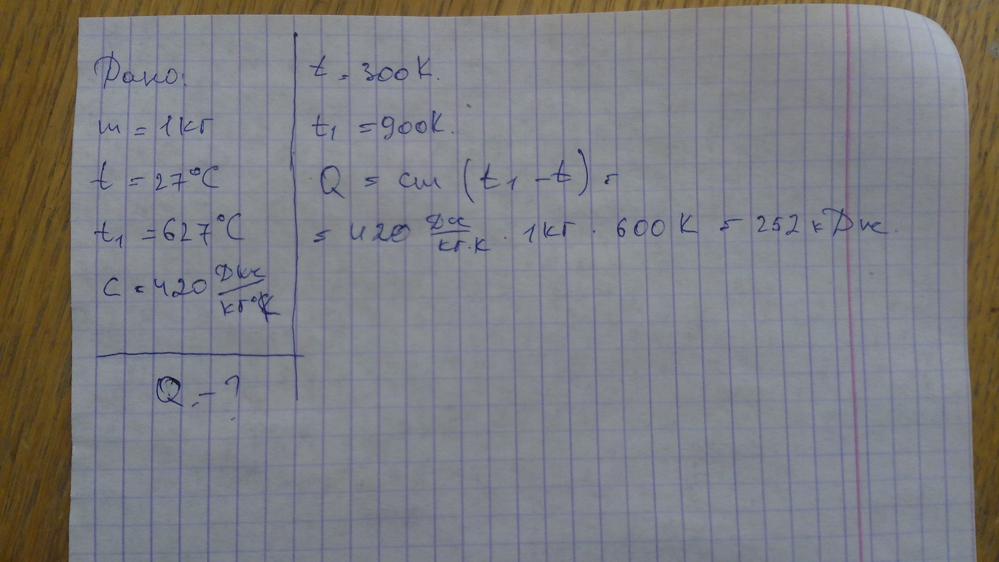 бронзовый подсвечник массой в кг нагрели от 27 до 627. какое количество теплоты сообщено подсвечнику? удельная тёплое кость бронзы 420 Дж/кгК