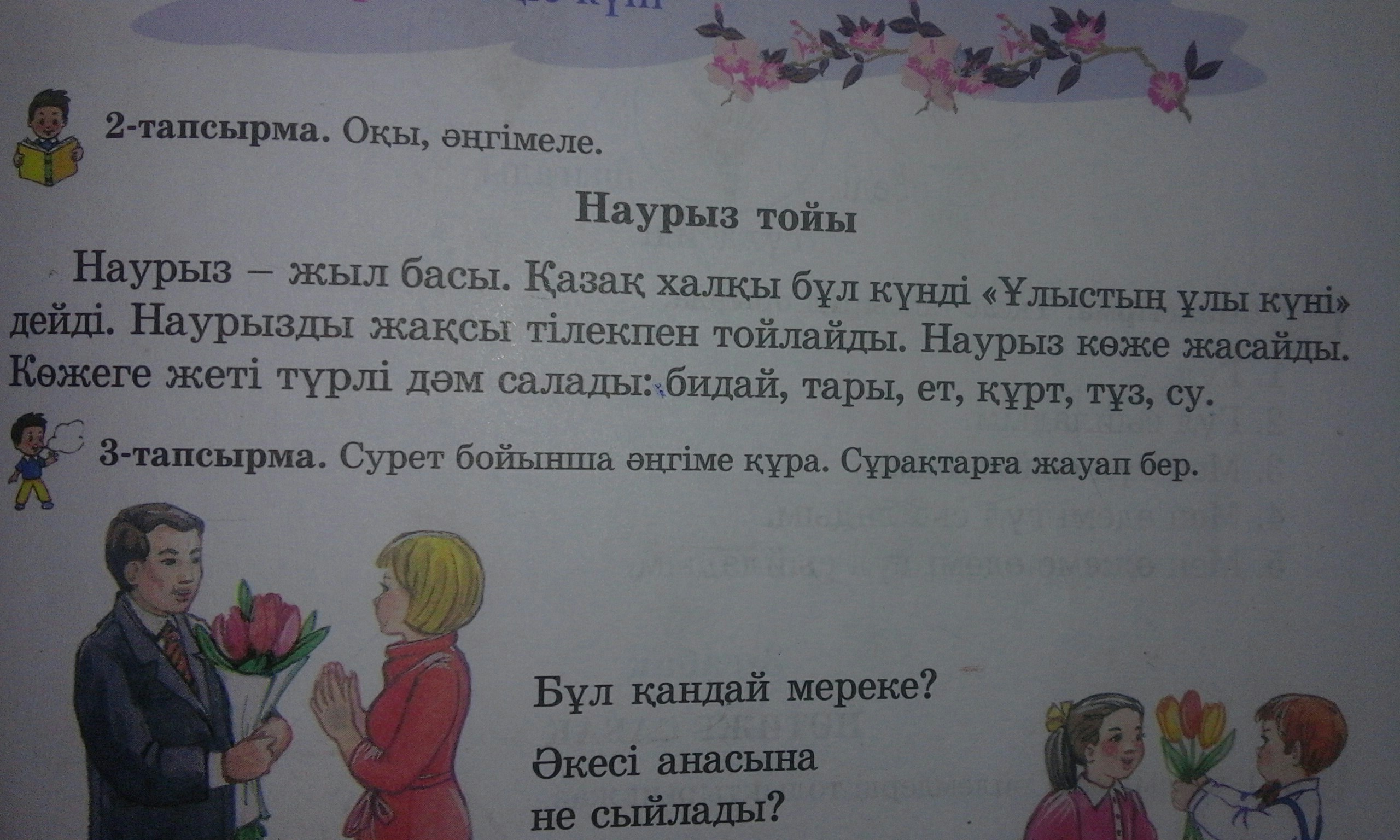 Наурыз-начало года.Казахи называют этот день "Великий день нации".Наурыз отмечают с хорошими пожеланиями.Делают Наурыз Коже.В Коже добавляют семь разных продуктов:пшеница,мельница,мясо,курт (белый,кислый в виде камня),соль,вода.