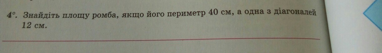 знайти площу ромба, якщо периметр 40, а діагональ 12