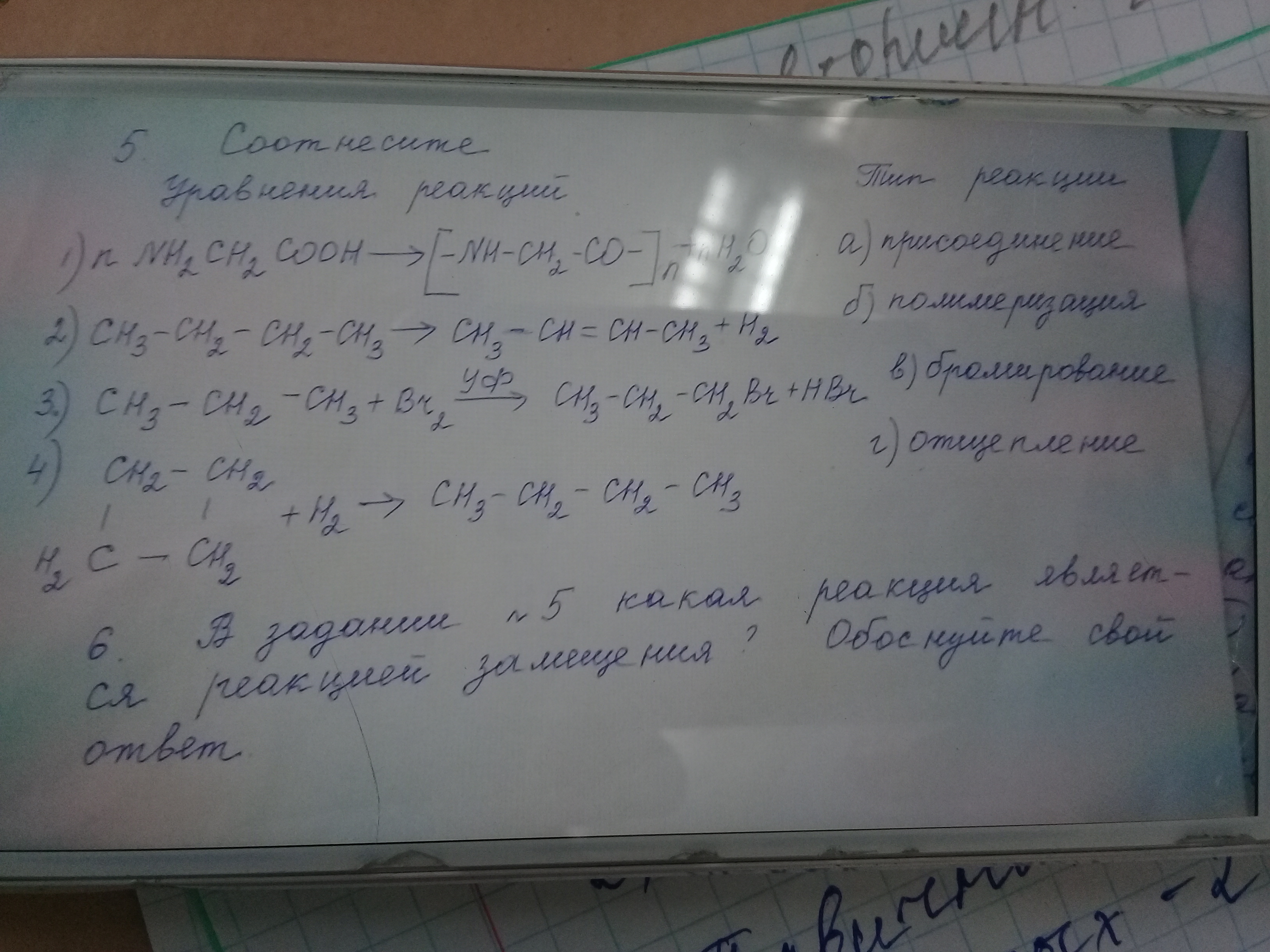 6 - реакция замещения 3 - бромирование, поскольку один атом водорода в пропане замещается на один атом брома и вытесняется бромоводород