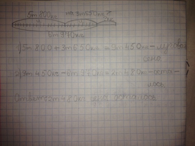 Для кормления животных фермер заготовил 5т800кг лесного сена,а лугового на 3т650кг больше,чем лесного.До нового года скормили 6т970кг сена.Сколько сена осталось?Кто зделает мне схему и решение тот вариант будет лучший