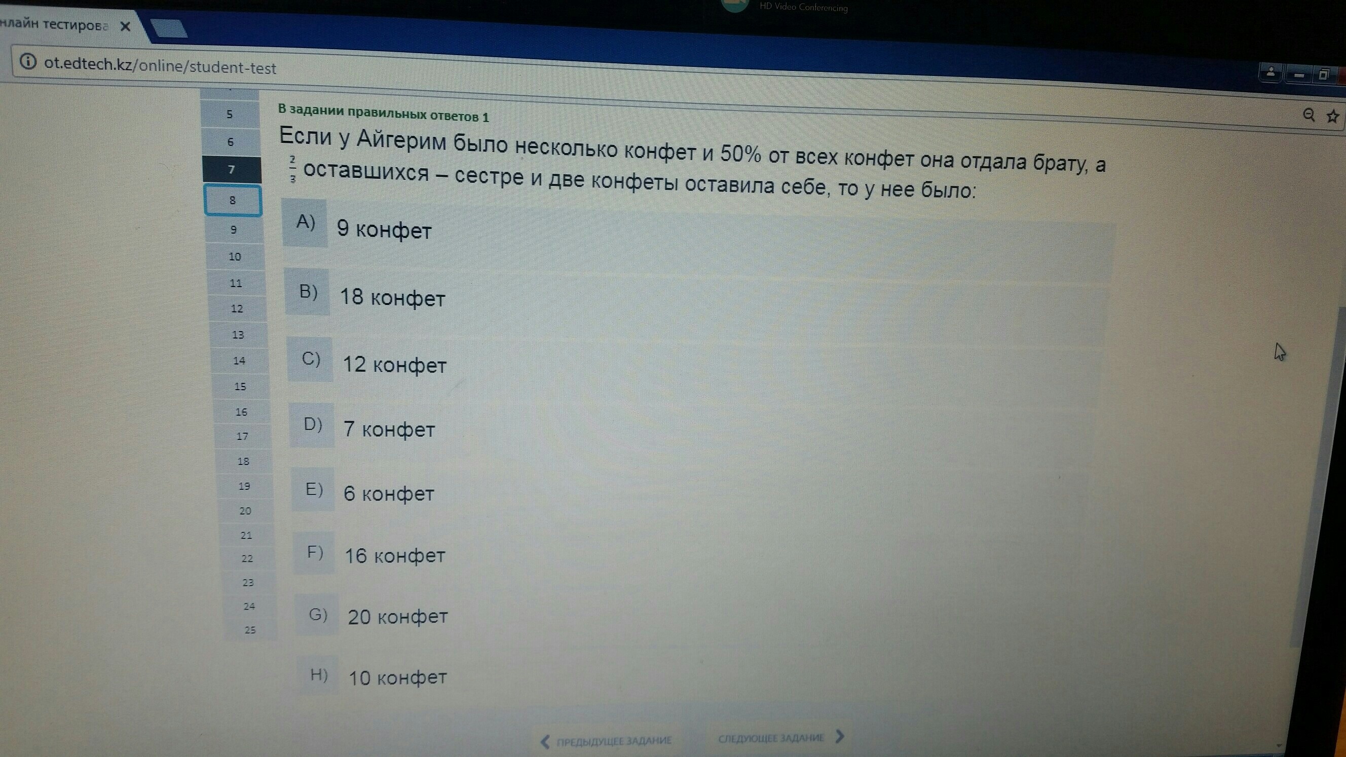3/3-2/3=1/3 часть у нее осталось отсюда следует, что 1/3 часть это 2 конфет.
