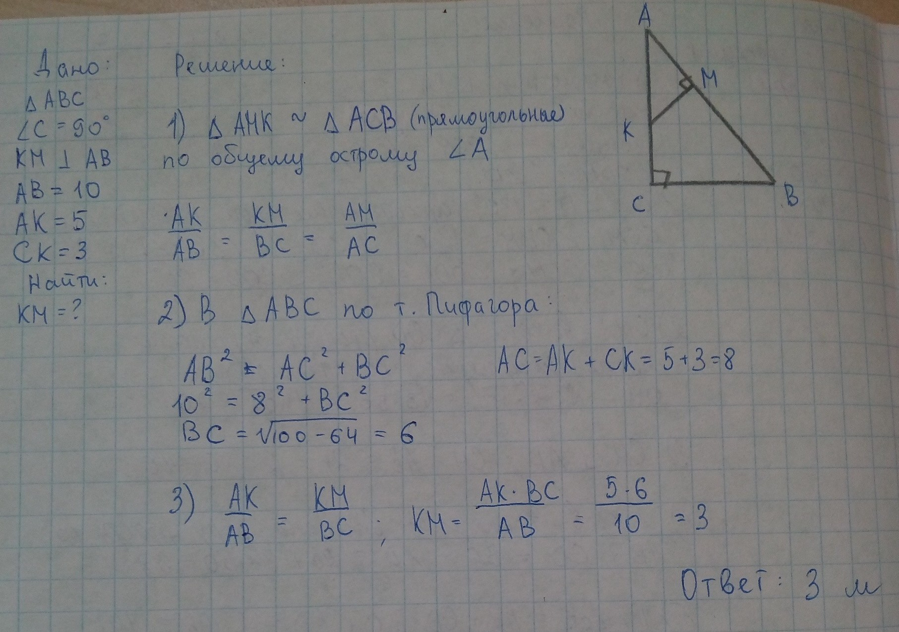 1. Из точки К катета АС прямоугольного треугольника АВС проведен перпендикуляр КМ к гипотенузе АВ. Найдите КМ, если АВ равен 10м, АК=5м, КС=3м.